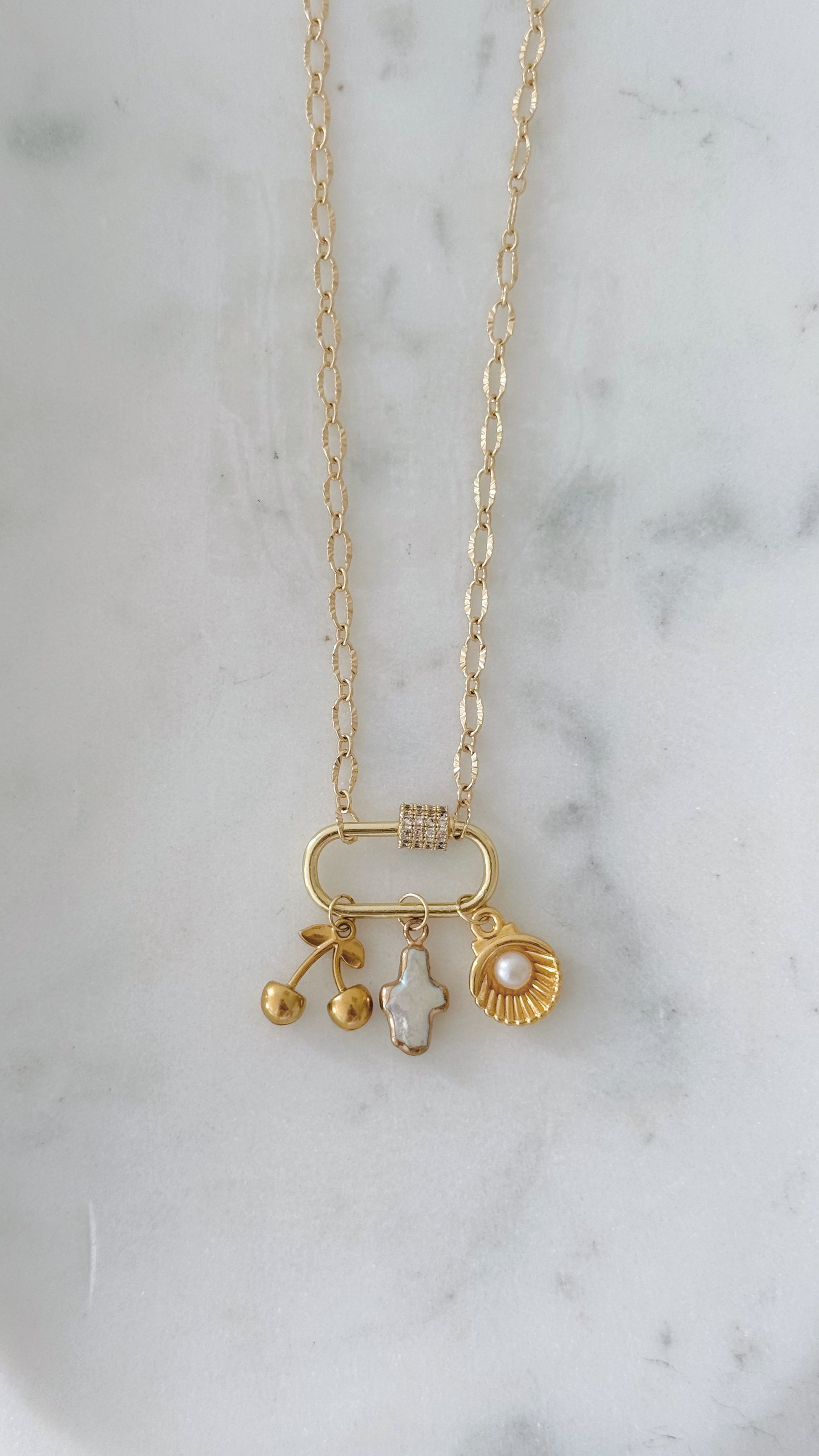 Hanging from the carabiner are three charm details with seaside charm and meaning: a gold cherry charm for a fun, feminine touch, a pearl cross charm for timeless elegance, and a gold seashell charm with a pearl center inspired by sun-soaked days by the sea. Crafted with tarnish-resistant stainless steel, this piece is perfect worn alone or layered for an effortless coastal look.