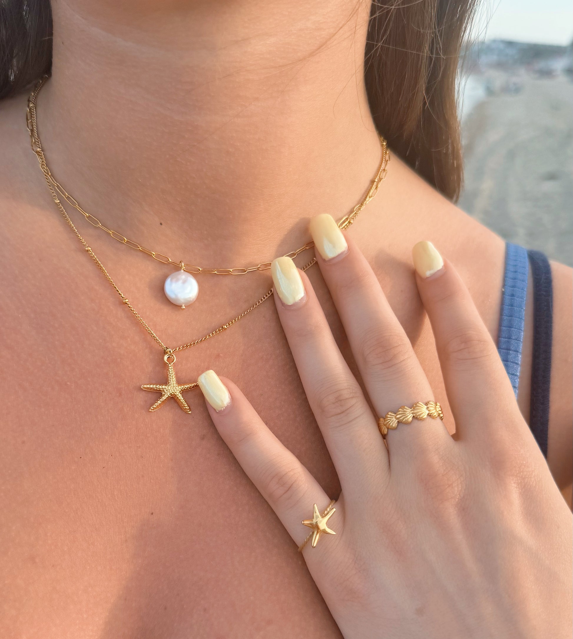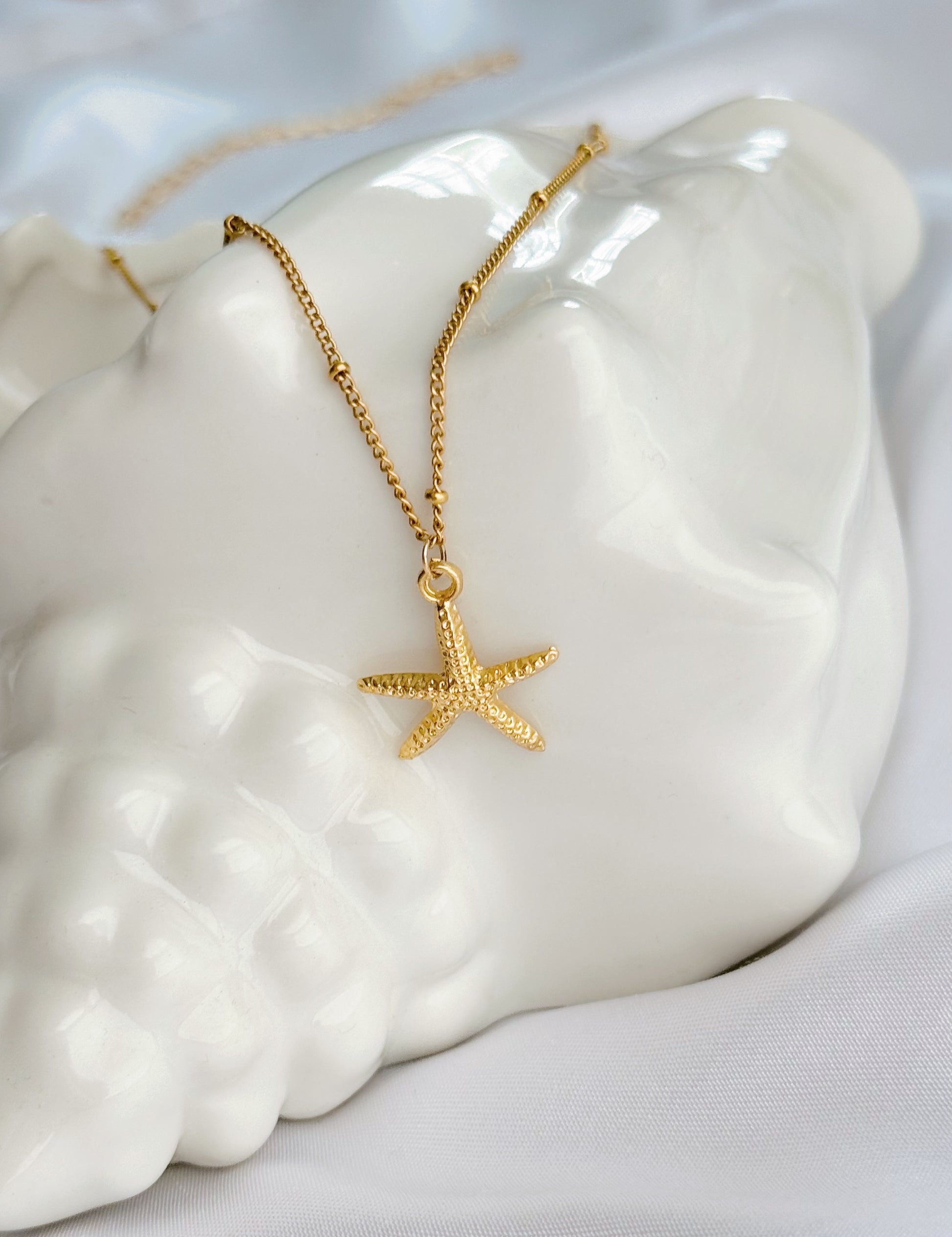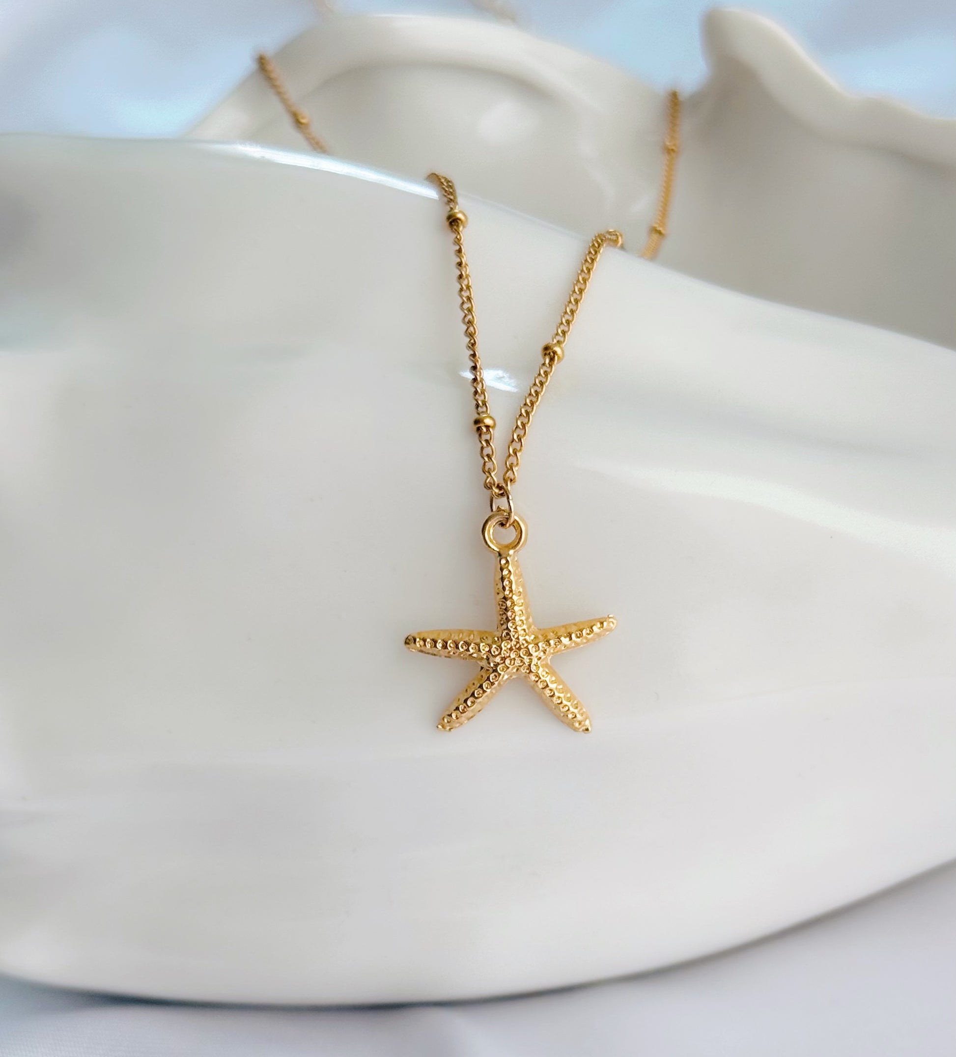 Bring the ocean breeze to your style with our Dainty Starfish Charm Necklace! This sea-inspired piece features a delicate gold starfish charm on a gold-plated satellite chain, adding just the right amount of shimmer and texture. Choose your perfect look with or without a turquoise gem accent for a personalized touch. Wear it solo as a subtle statement piece or layer it with our other ocean-inspired necklaces for the ultimate beachy vibe. It’s the perfect accessory for anyone who loves the sea and makes an ideal gift for beach lovers!