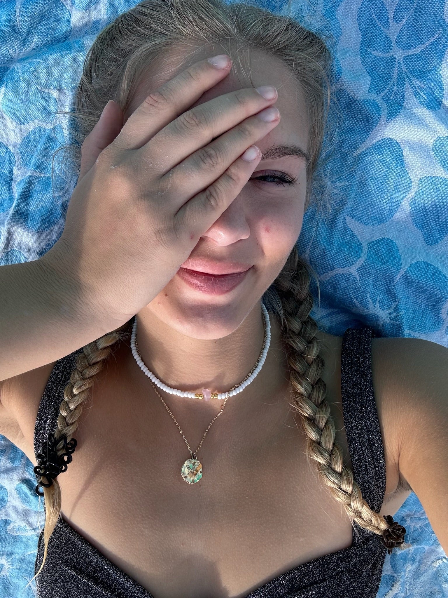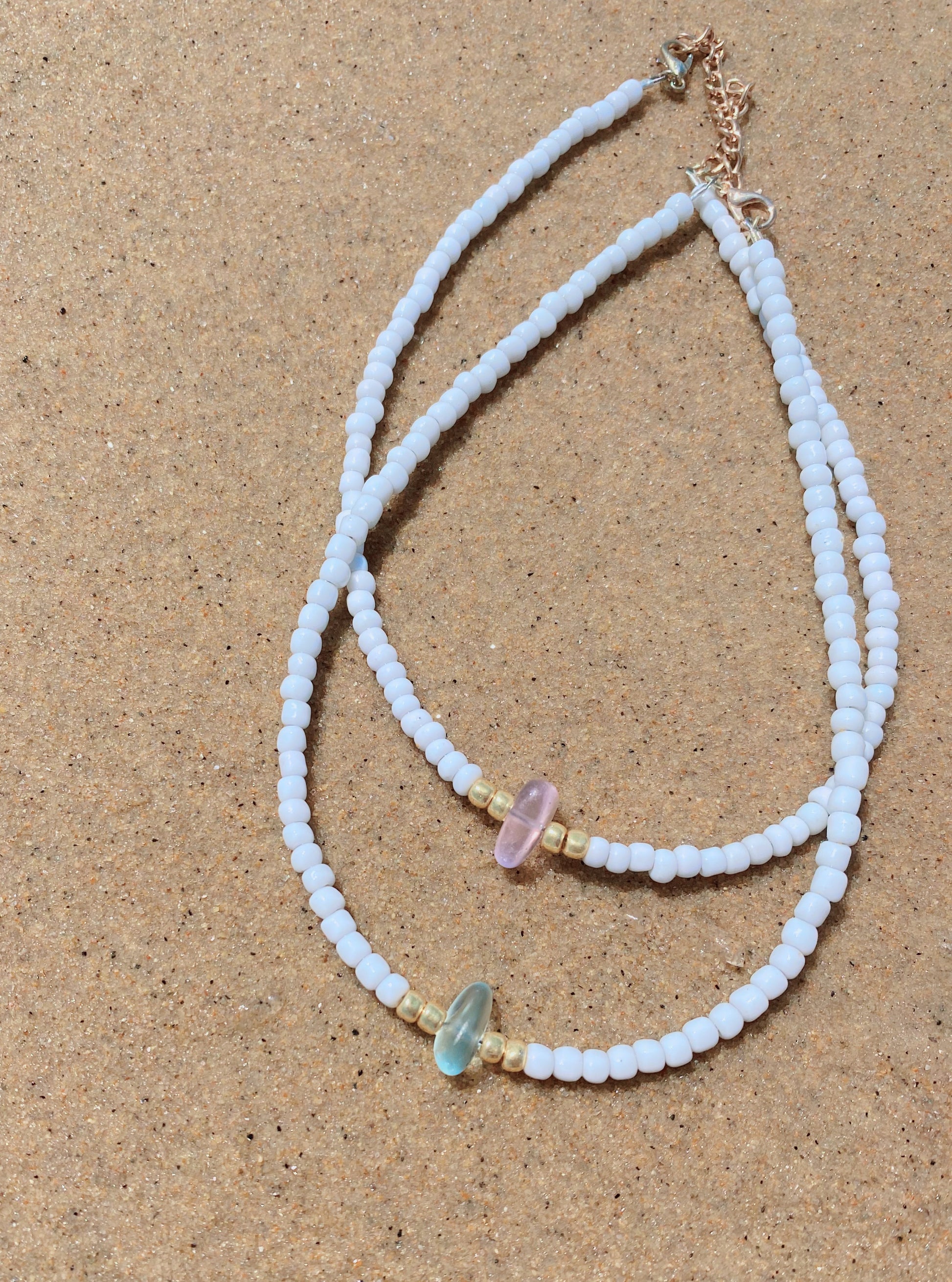 Delicate, beachy, and effortlessly stylish, the Sea Glass Beaded Necklace is the perfect accessory for ocean lovers. This white seed bead necklace features a pink or blue sea glass bead, symbolizing the beauty of waves and sunlit shores, surrounded by shimmering gold beads for an elegant touch. Lightweight and versatile, this piece is perfect for layering or wearing solo for a minimalist, coastal-inspired look. Whether you're strolling the beach or embracing everyday seaside vibes, the Sea Glass Beaded Necklace adds a dreamy, ocean-kissed glow to any outfit.